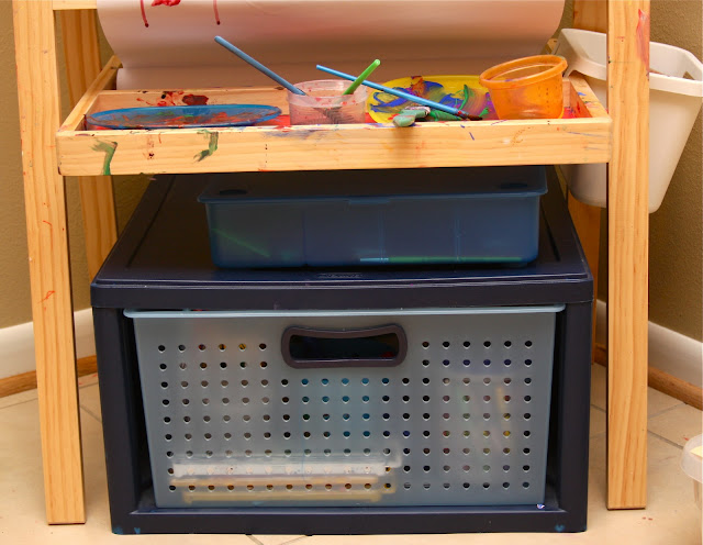 I like this Sterlite drawer ($20 at Target) because it fits nicely under the easel, it is tall enough that I can have containers for pens to sit upright, and it's easy enough for my son to open and close by himself. It's also deep enough that I can put the paint in the back and he never seems to see it without me getting in there too.